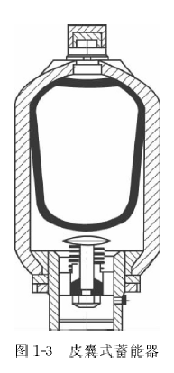 皮囊式蓄能器(如圖1-3)由鍛造或鑄造而成的壓力罐、皮囊、氣體入口閥和油入口閥組成。皮囊材質(zhì)按標準,通常采用丁腈橡膠、丁基橡膠、氟化橡膠、環(huán)氧乙烷-環(huán)氧化氯丙烷橡膠等材料。