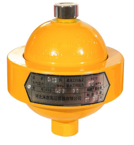 隔膜式蓄能器是兩個半球形殼體扣在一起,兩個半球之間夾著一張橡膠隔膜,講油和氣分開。其重量和容積比最小,反應靈敏,低壓消除脈動效果顯著。隔膜式蓄能器橡膠薄膜面積較小,氣體膨脹受到限制,所以充氣壓力有限,容量小。